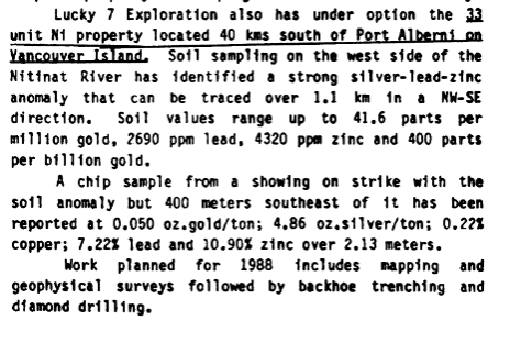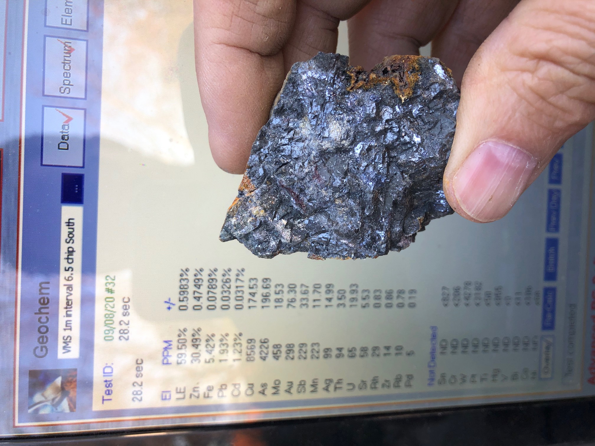 - A core sample from a shallow drill hole across a 1.3 metre section assayed 0.17 per cent copper, 6.87 per cent lead, 6.61 per cent zinc, 94.61 grams per tonne silver and 1.3 grams per tonne gold.
